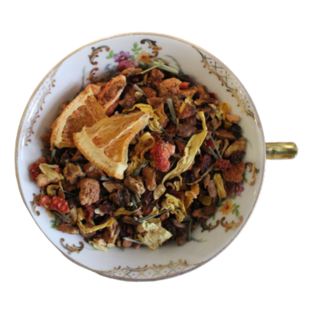 Zutaten: Apfelstücke, Hagebuttenschalen, Zitrusschalen, Erdbeerstücke, Sonnenblumenblüten, Bambusblätter, Säuerungsmittel Zitronensäure. Ziehzeit: 8-12 Min.