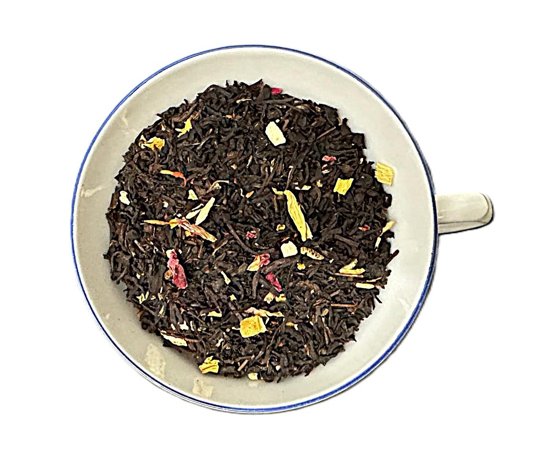Zutaten: schwarzer Tee, Orangenschalen, Rosenblüten, Saflorblüten, Aroma.