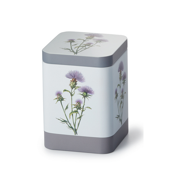 Diese schöne Weißblechdose macht eine außergewöhnliche Pflanze zum Hauptdarsteller, die Distel. Mit ihren üppigen Blütenköpfen und der markanten Wuchsform zieht sie alle Blicke auf sich. Doch Vorsicht, die Schönheit ist nicht ohne, denn ihre pieksige Natur verleiht ihr Charakter und Stärke. Besonders ins Auge fällt das intensive Farbspiel der Blütenblätter. Tiefes Blau und leuchtendes Lila lassen die Pflanze regelrecht strahlen und verleihen dem Design eine besondere Tiefe. Unterstützt wird die Wirkung durch eine matte Oberflächenveredelung, die dem Ganzen eine edle Zurückhaltung gibt. Der Hintergrund in Taubenblau und Anthrazit sorgt für eine moderne, stilvolle Anmutung. Apropros modern: in der Floristik liegt die Distel absolut im Trend und findet sich derezit neben Eukalyptus in Kränzen, Sträußen und Tischdekorationen. Unsere Distel stammt direkt von heimischen Wiesen und Feldern. Sie ist nicht nur dekorativ, sondern erfüllt auch eine wichtige ökologische Funktion: Als Nektarquelle zieht sie zahlreiche Insekten und Schmetterlinge an. Eine Pflanze also, die nicht nur gut aussieht, sondern auch Gutes tut. Der stilvolle, nach innen gerollte Deckelrand verleiht dieser schönen Dose einen besonderen Touch. Mit den Produktmaßen von 7,3 x 7,3 x 10 cm eignet sich der Artikel ausgezeichnet zur Lagerung von ca. 100 g Tee. Auch als Geschenk oder für die Aufbewahrung süßer Leckereien ist diese Dose die perfekte Wahl.